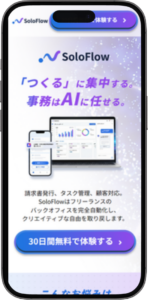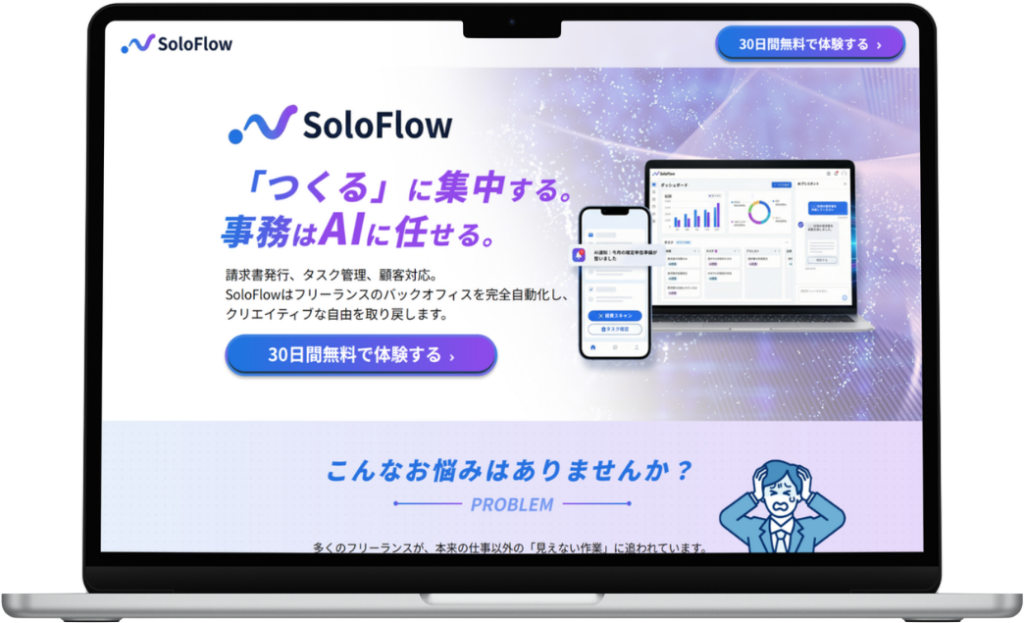 学習の一環として制作した、架空のAI業務効率化サービス「SoloFlow」のLPです。